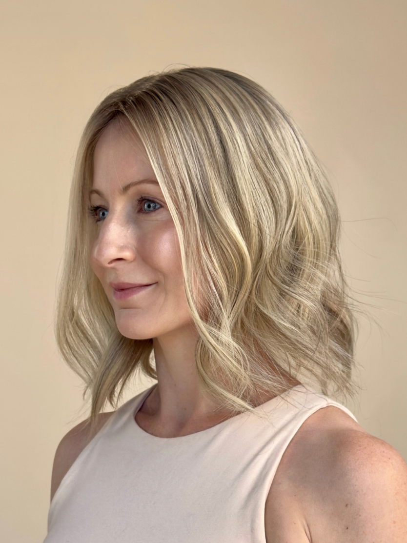 This shade features a soft, natural light dirty blonde base, complemented by a slight ash root for a seamless, blended effect. Subtle lowlights add depth and dimension, preventing the colour from looking flat while maintaining a cool, natural tone. The result is a ived-in blonde with a soft, effortless finish.