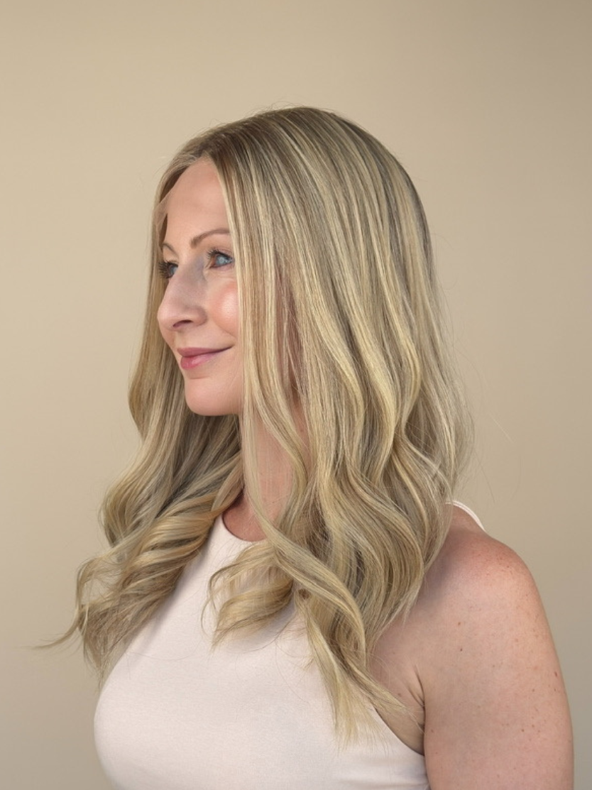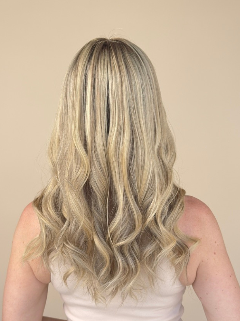 This shade features a soft, natural light dirty blonde base, complemented by a slight ash root for a seamless, blended effect. Subtle lowlights add depth and dimension, preventing the colour from looking flat while maintaining a cool, natural tone. The result is a lived-in blonde with a soft, effortless finish.
