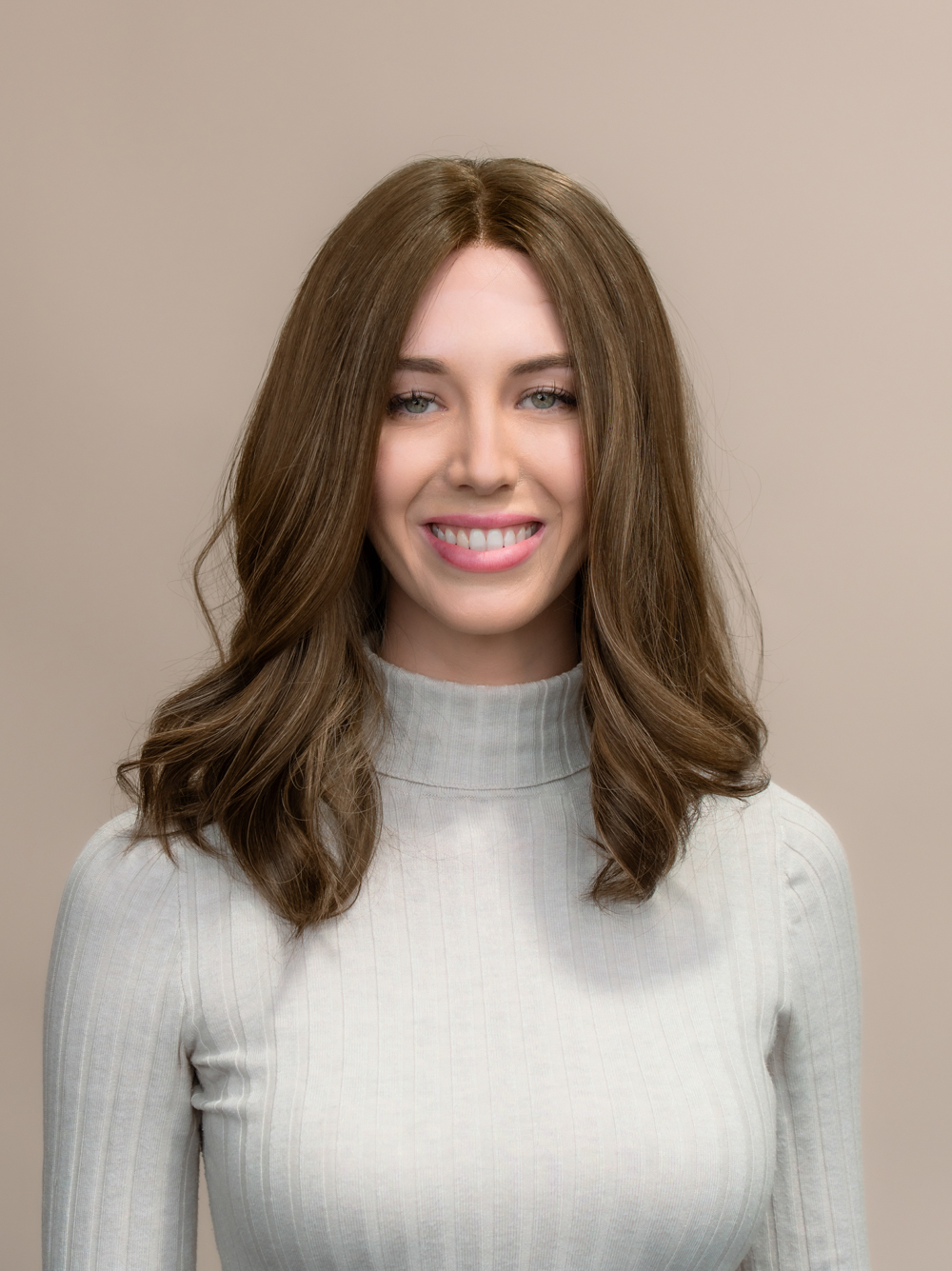 This shade features a rich, mocha-toned brown base with a matte, neutral finish, giving it a soft, sophisticated look without excessive warmth or brassiness. Delicate pale blonde babylights are finely woven throughout, adding subtle brightness and dimension while maintaining a natural, blended effect. The result is a refined, multi-dimensional brunette with a soft, seamless contrast that enhances depth and movement.