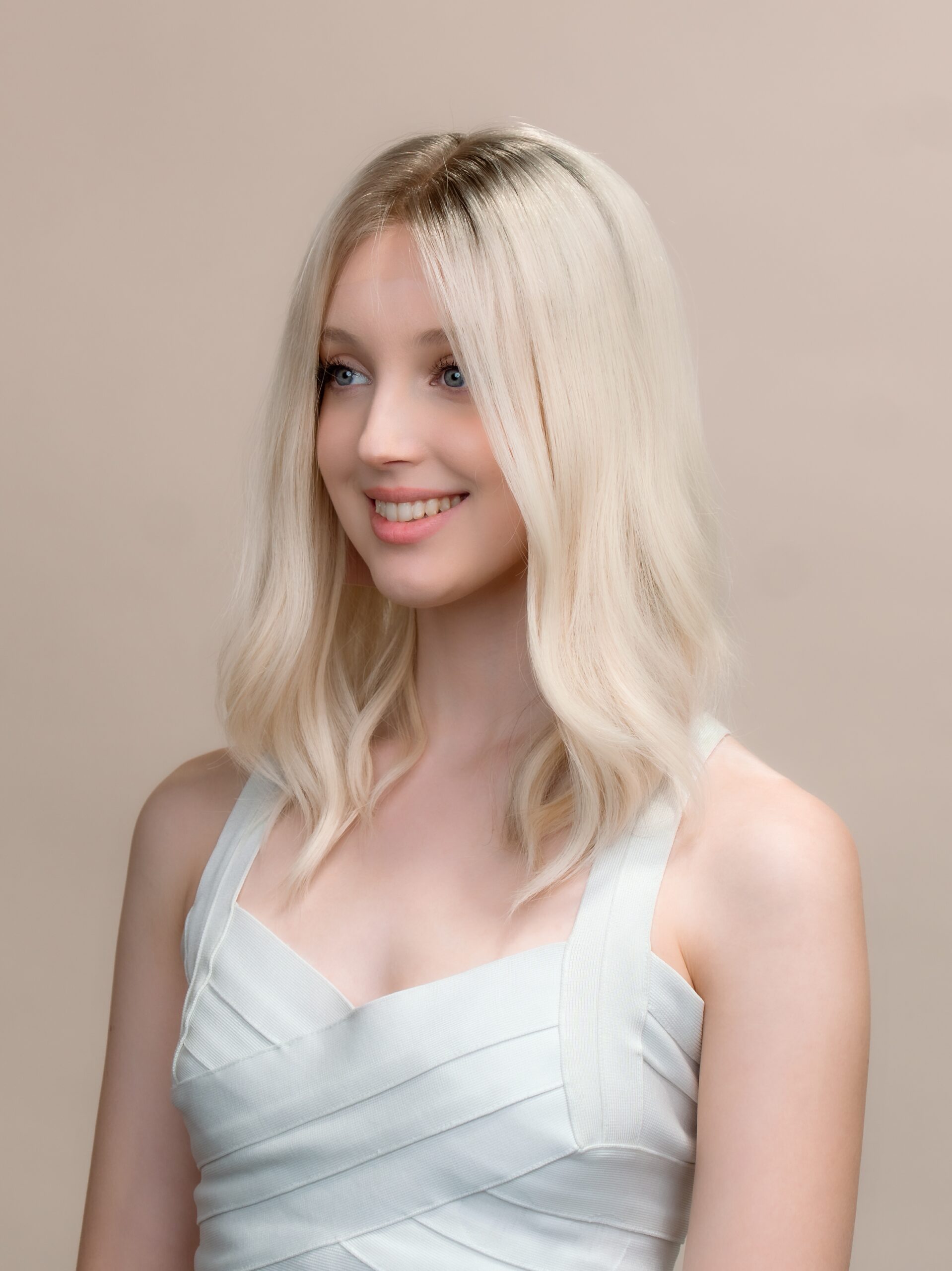 A luminous ultra-light blonde with cool tones and a soft ash root to neutralise warmth and create a clean, bright finish. The medium-density lace top cap includes a silk layer for a realistic scalp effect and breathable comfort.