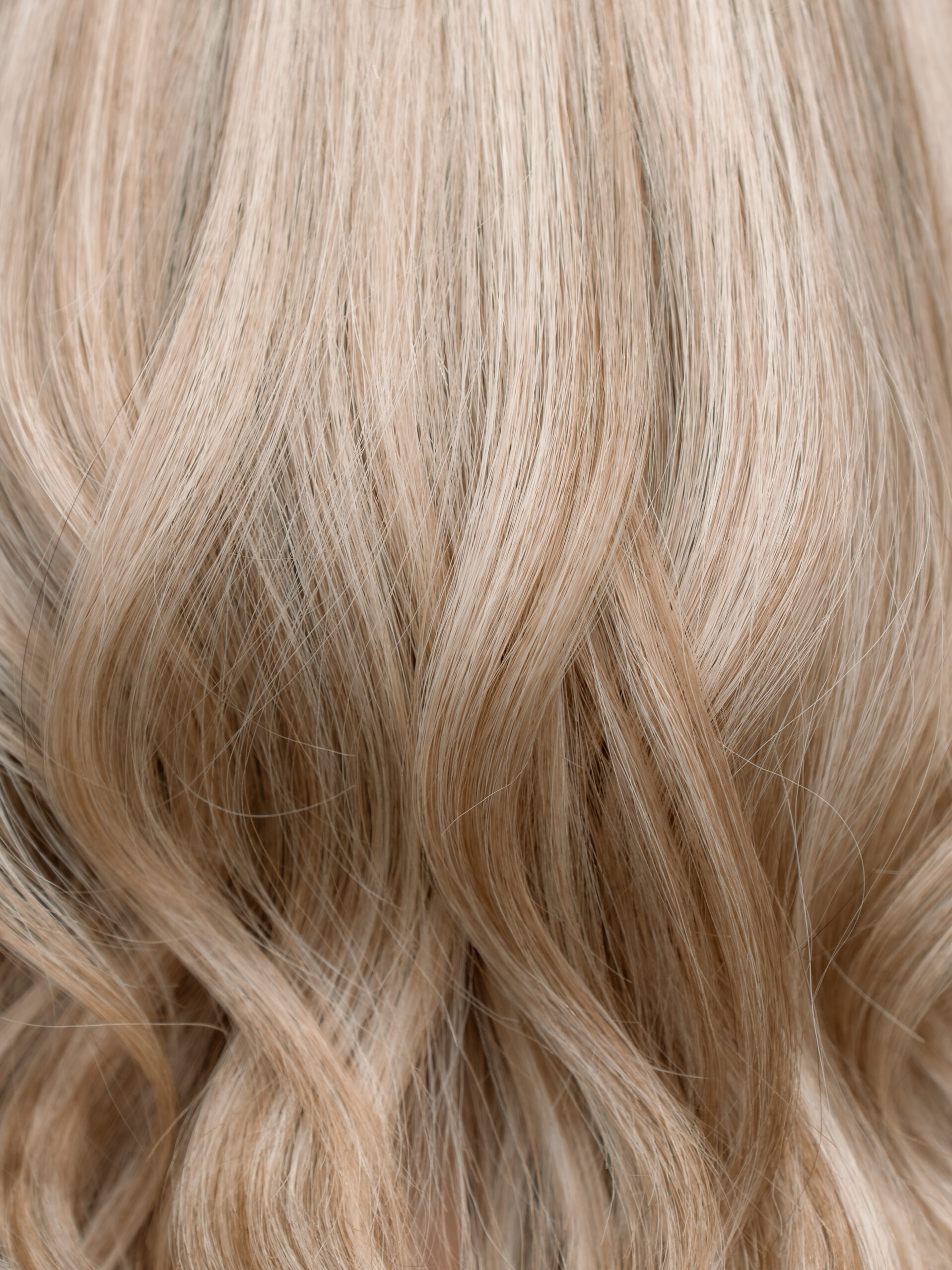 A soft blonde base enhanced with ultra-light highlights for a bright, sun-kissed glow. The lace top wig design offers a natural hairline, breathable comfort, and styling versatility. Made from premium remy human hair, it can be styled with hot tools or worn straight — radiant, soft, and beautifully natural.