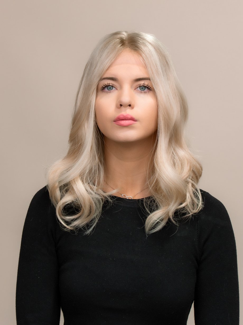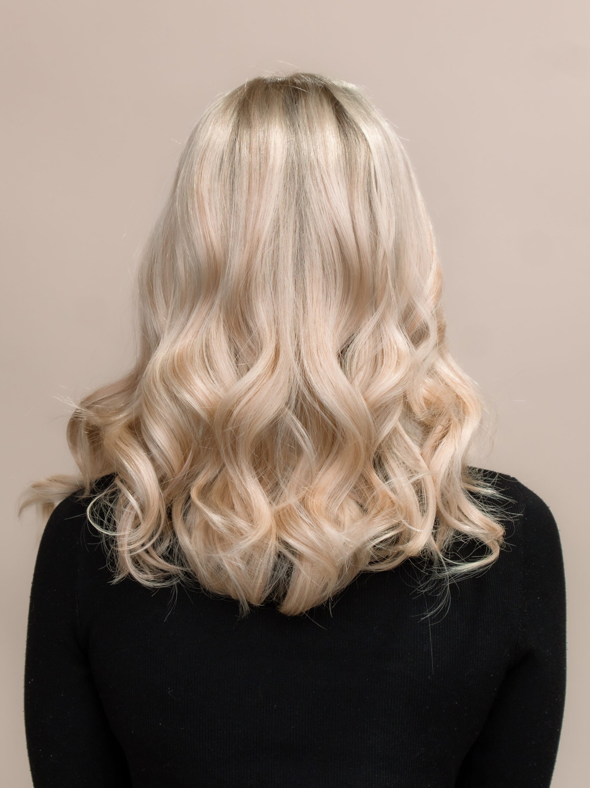 This shade is a soft, uniform creamy pale blonde, offering a bright, even-toned look without contrast or dimension. Perfect for those who love a clean, pure blonde with a soft, luminous effect.