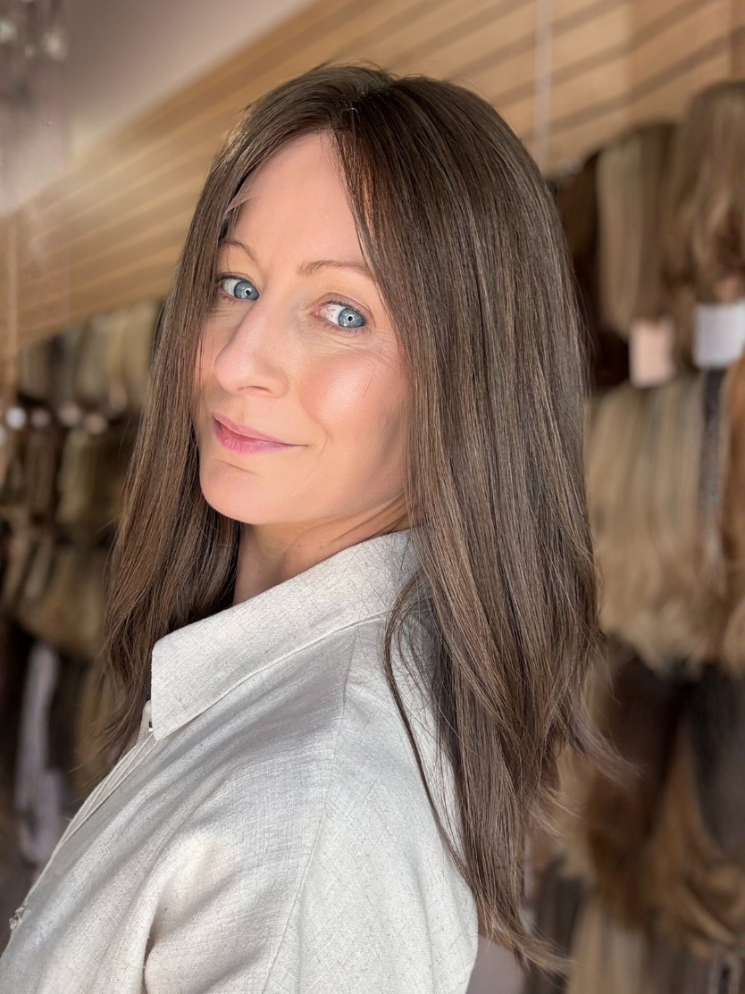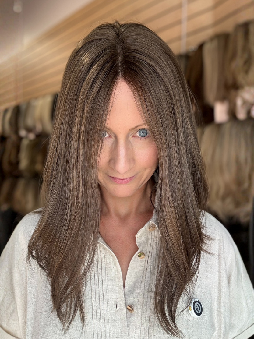 Maddie is a natural medium brunette with soft beige highlights woven through for gentle contrast and a lived-in feel. The mocha base keeps it grounded and wearable, while the subtle beige tones add lightness and movement without looking streaky or overdone.