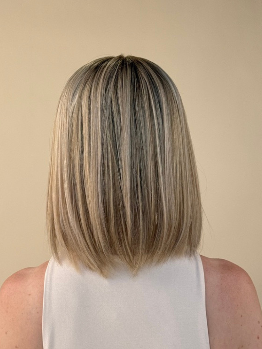 This shade features a soft, neutral beige blonde base with delicate, understated dimension for a natural, seamless look. The darker root smudge creates a soft blend, mimicking natural hair growth and adding depth without harsh contrast. The result is a low-maintenance, effortlessly chic blonde with a creamy, sun-kissed finish.