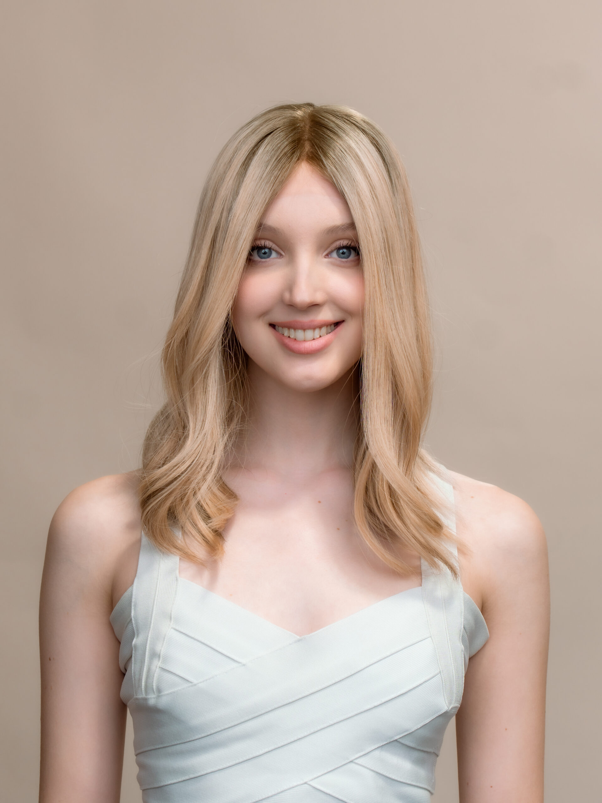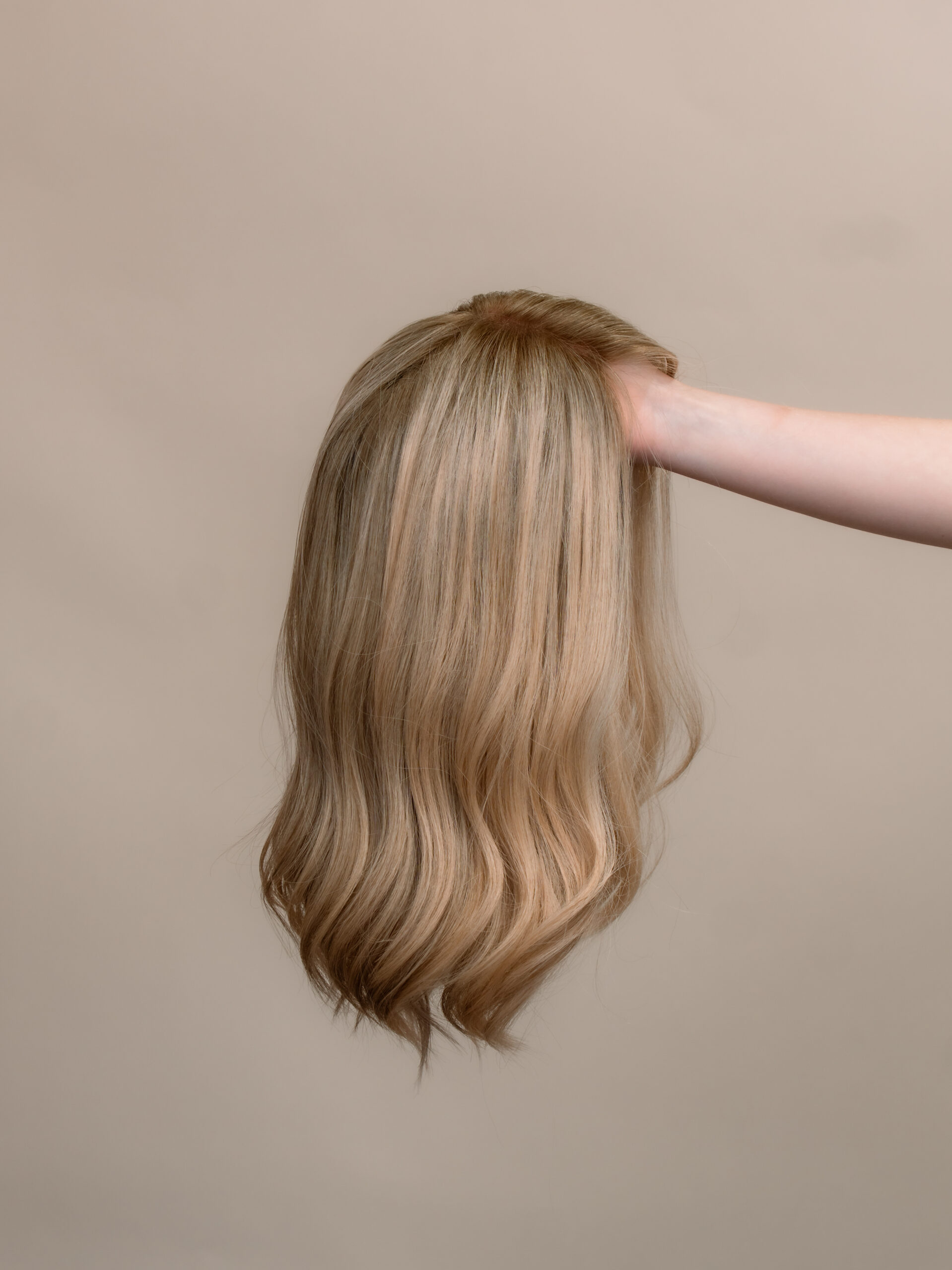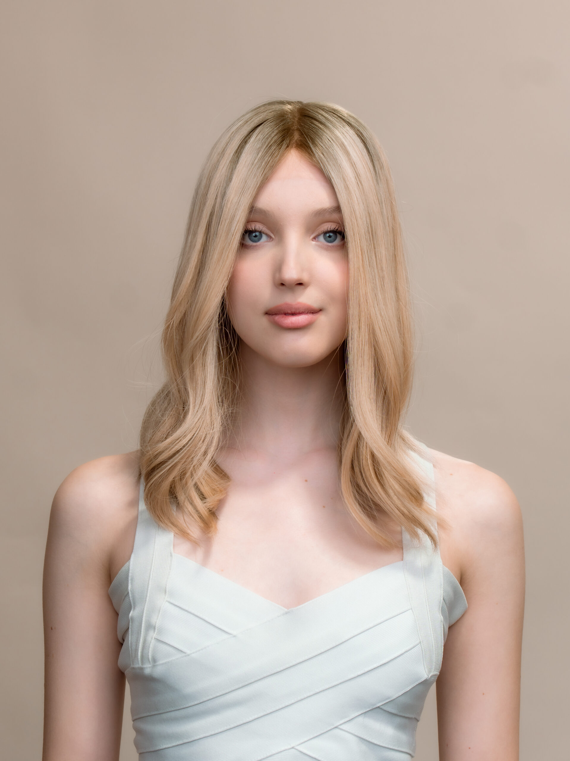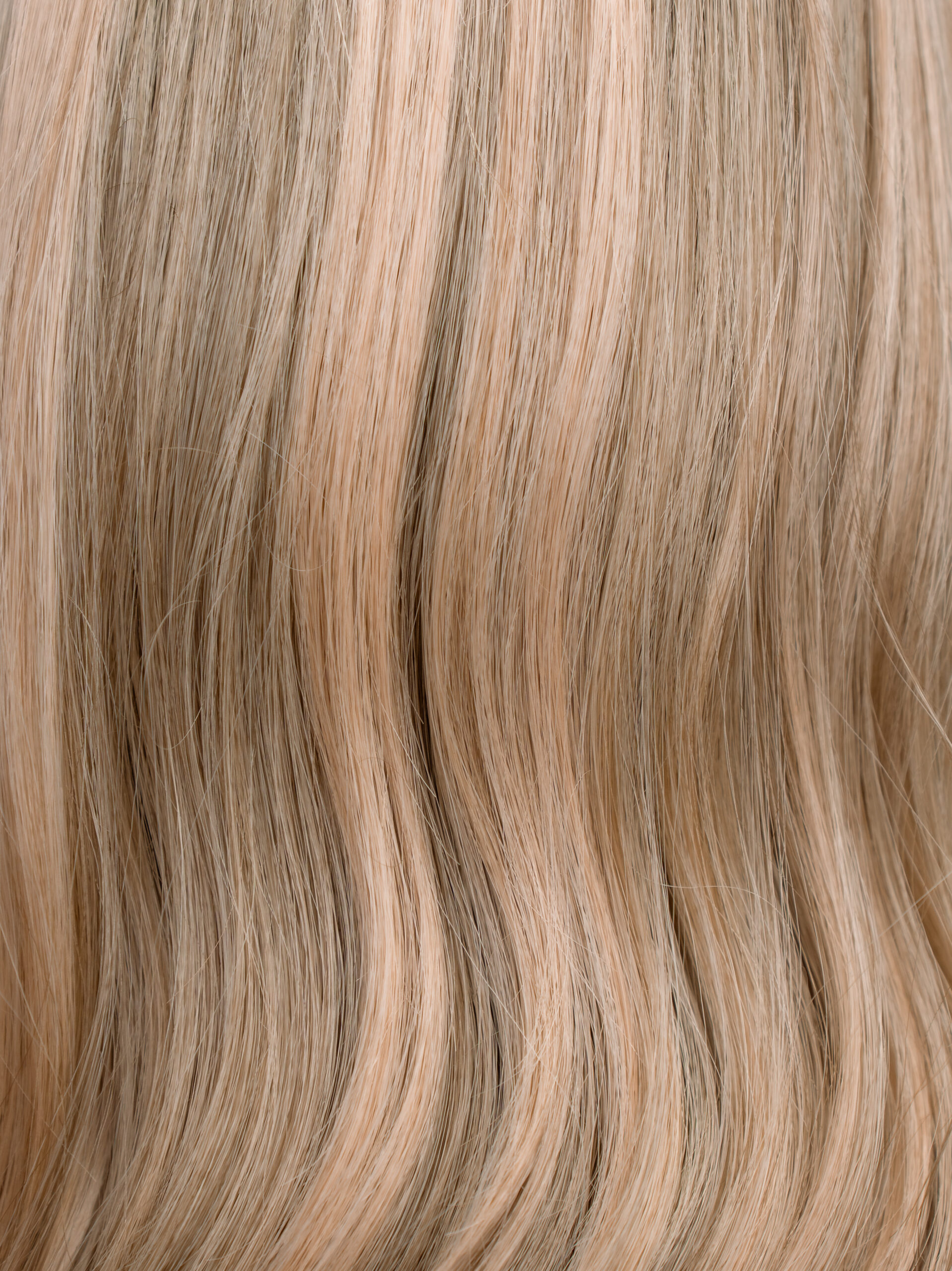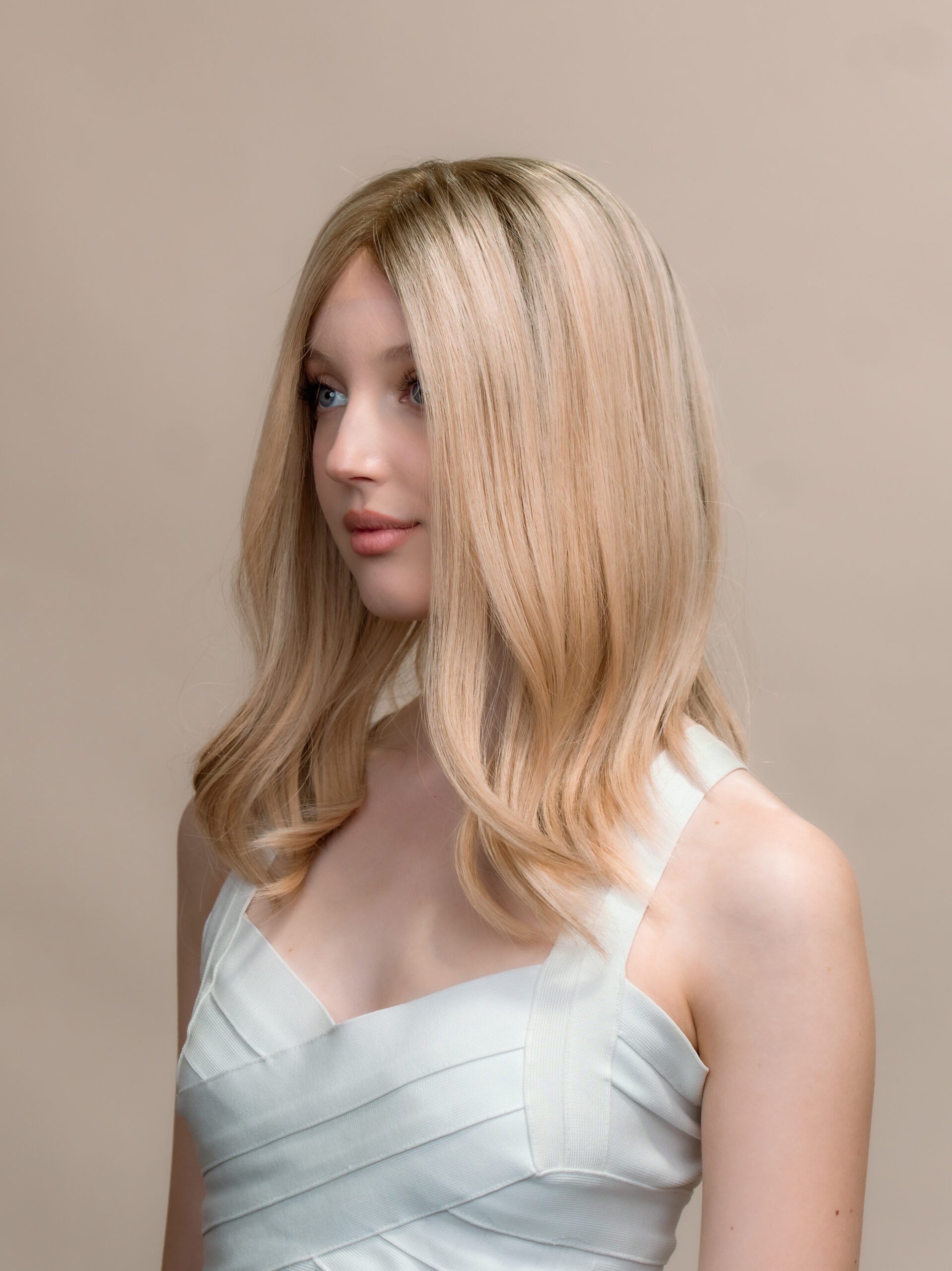 A soft, neutral beige blonde with delicate dimension and a gentle root smudge for a natural, sun-kissed blend. The lace top wig design offers a realistic hairline, breathable comfort, and styling versatility. Made from premium remy human hair, it can be worn straight or styled with hot tools — lightweight, natural, and ready to wear.