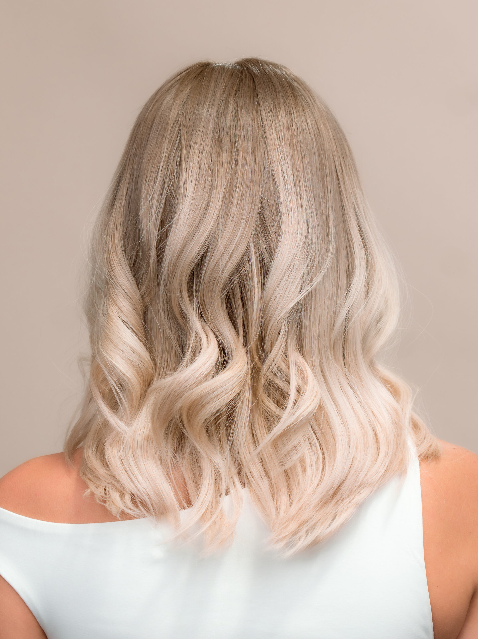 A cool, lived-in blonde that transitions from a dirty root to creamy sandy ends for a soft, sun-kissed look. The lace top wig design creates a realistic hairline, breathable comfort, and styling versatility. Made from premium remy human hair, it can be worn straight or styled with hot tools — bright, dimensional, and beautifully natural.