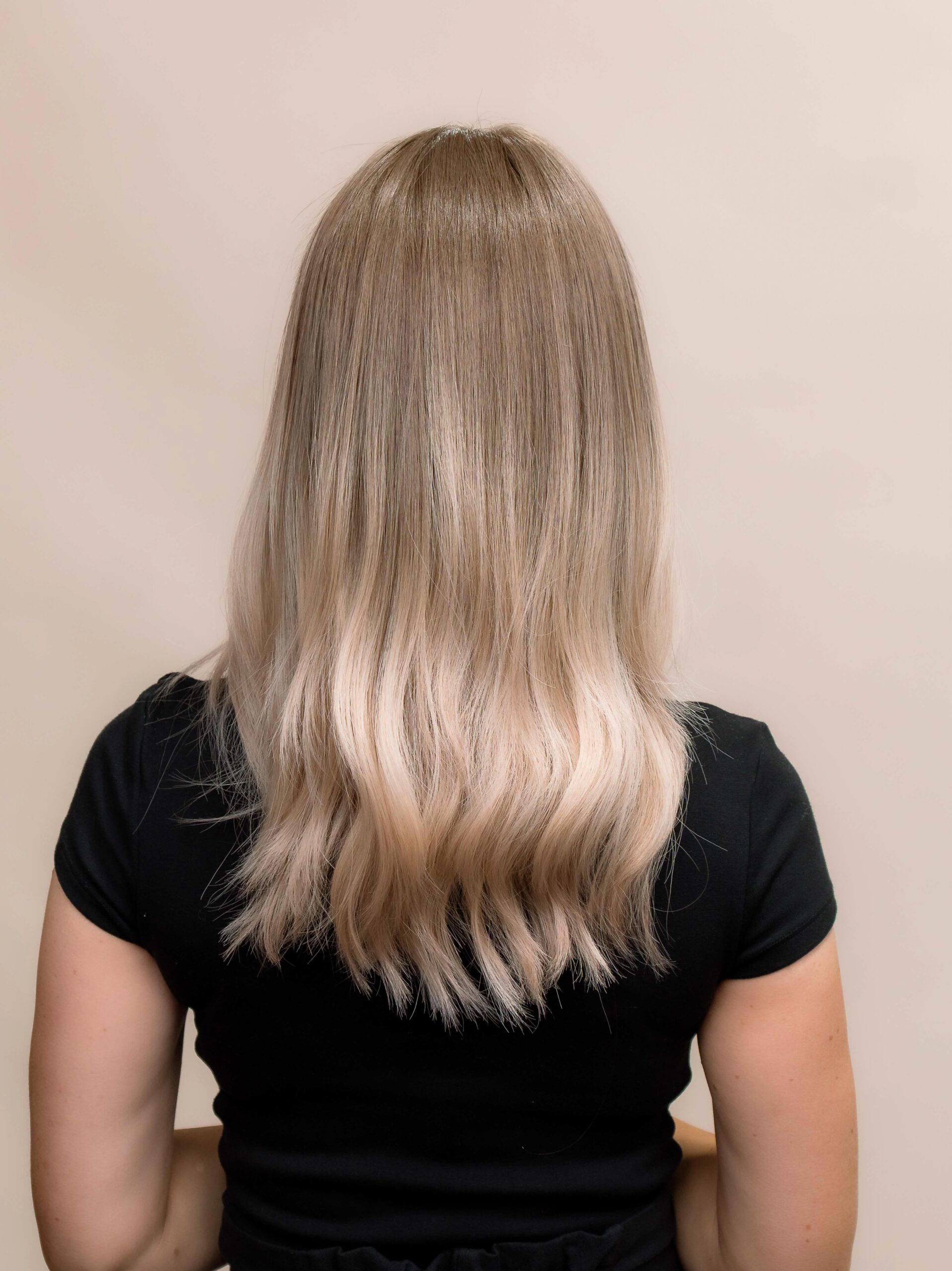 This colour features a soft, mousy dark blonde root that is stretched and seamlessly blended into beige, creamy light blonde ends. The gradual transition creates a natural, lived-in effect, mimicking a soft balayage. The beige and creamy tones add warmth and brightness. The result is a soft, effortless blonde with a beautifully blended, natural finish.