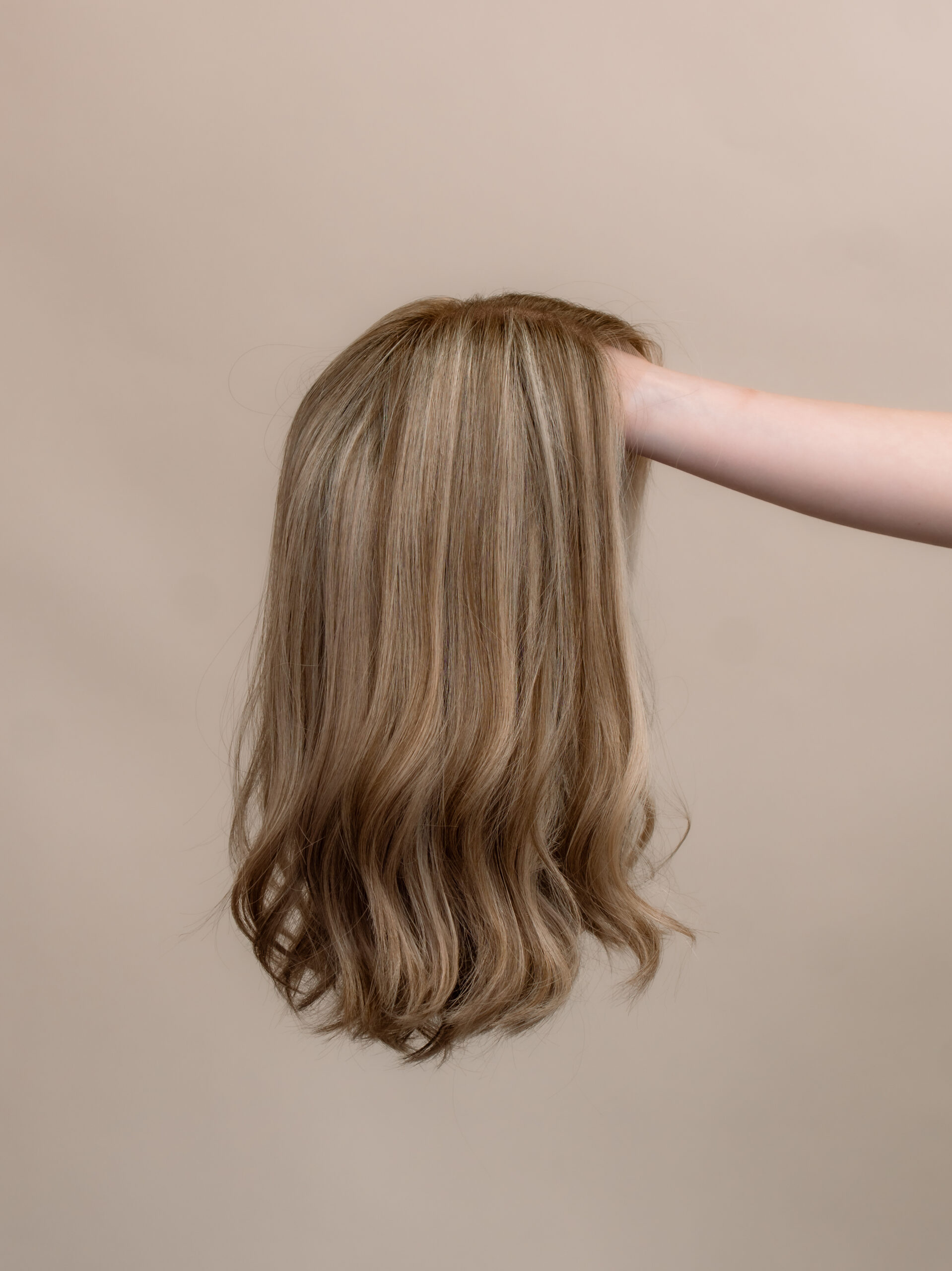 This dimensional brunette features a seamless blend of rich brunette tones, softly layered with fine highlights to add movement and light. The subtle rooting enhances the natural appearance, offering a soft transition that mimics real hair growth.